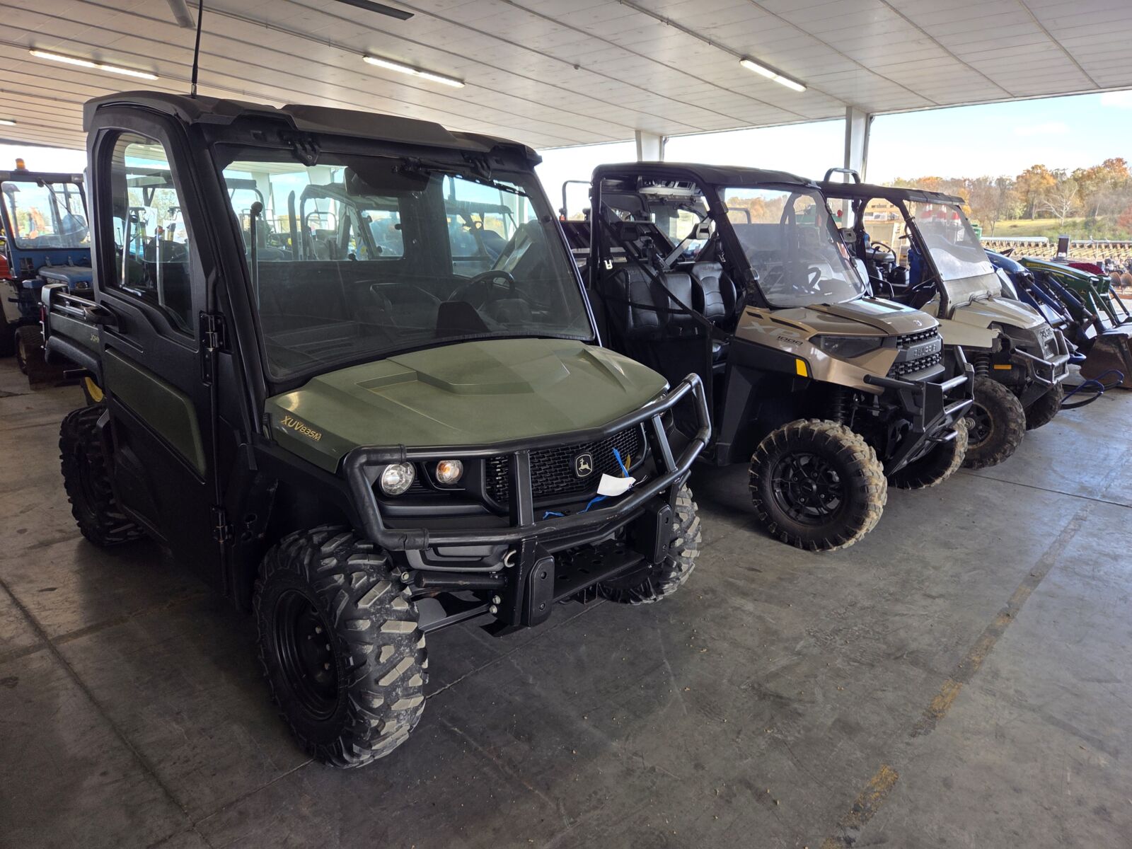 2023 Polaris Ranger XP1000 4×4, 135 hrs – nice; 2022 John Deere XUV865M gator, diesel, 4×4, 450 hrs, pwr dump, like new; 2021 Honda Pioneer 1000-5 4 seater, 4×4, 477 hrs; 2019 Argo 8 wheeler, 30hp Kohler gas; 2 – American Landmaster L4s, both new; 2023 American Landmaster L4 camo, 85 hrs; Kubota RTV1100 Cab, 4×4, dsl, snow plow & salt spreader; 2024 CF Moto Uforce 600 4×4, winch, only 12 miles!; 2014 Polaris Sportsman 570SP ATV, 4×4, EFI, 496 hrs; 2006 Honda TRX500FM ATV, 4×4, 249 hrs; Club Car golf cart & others.