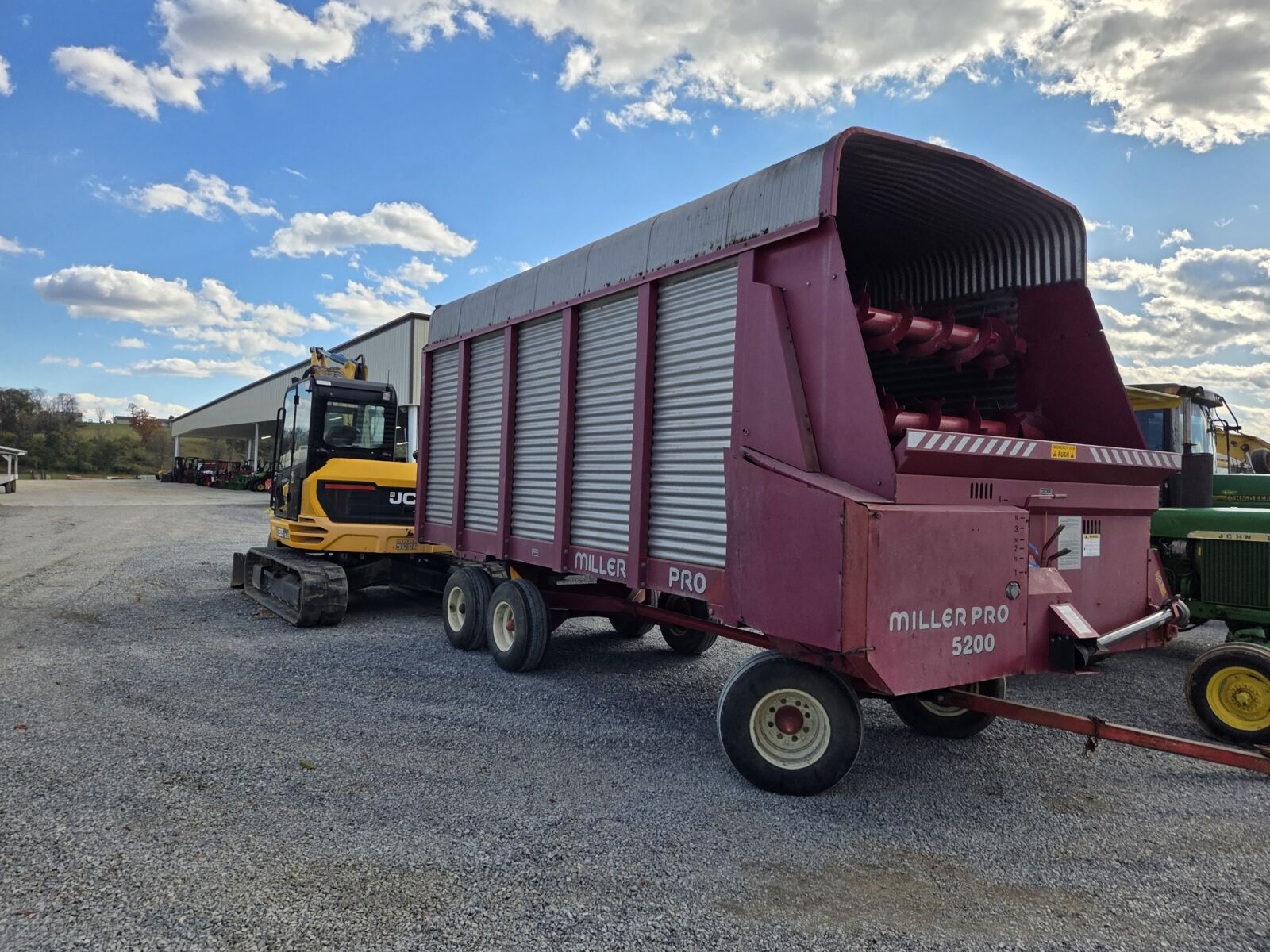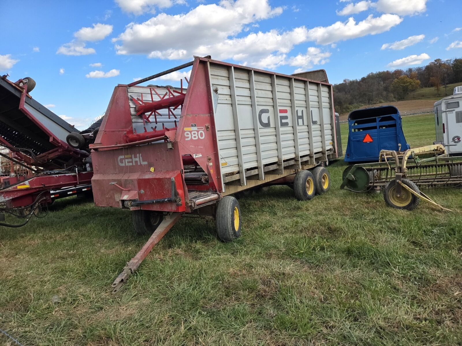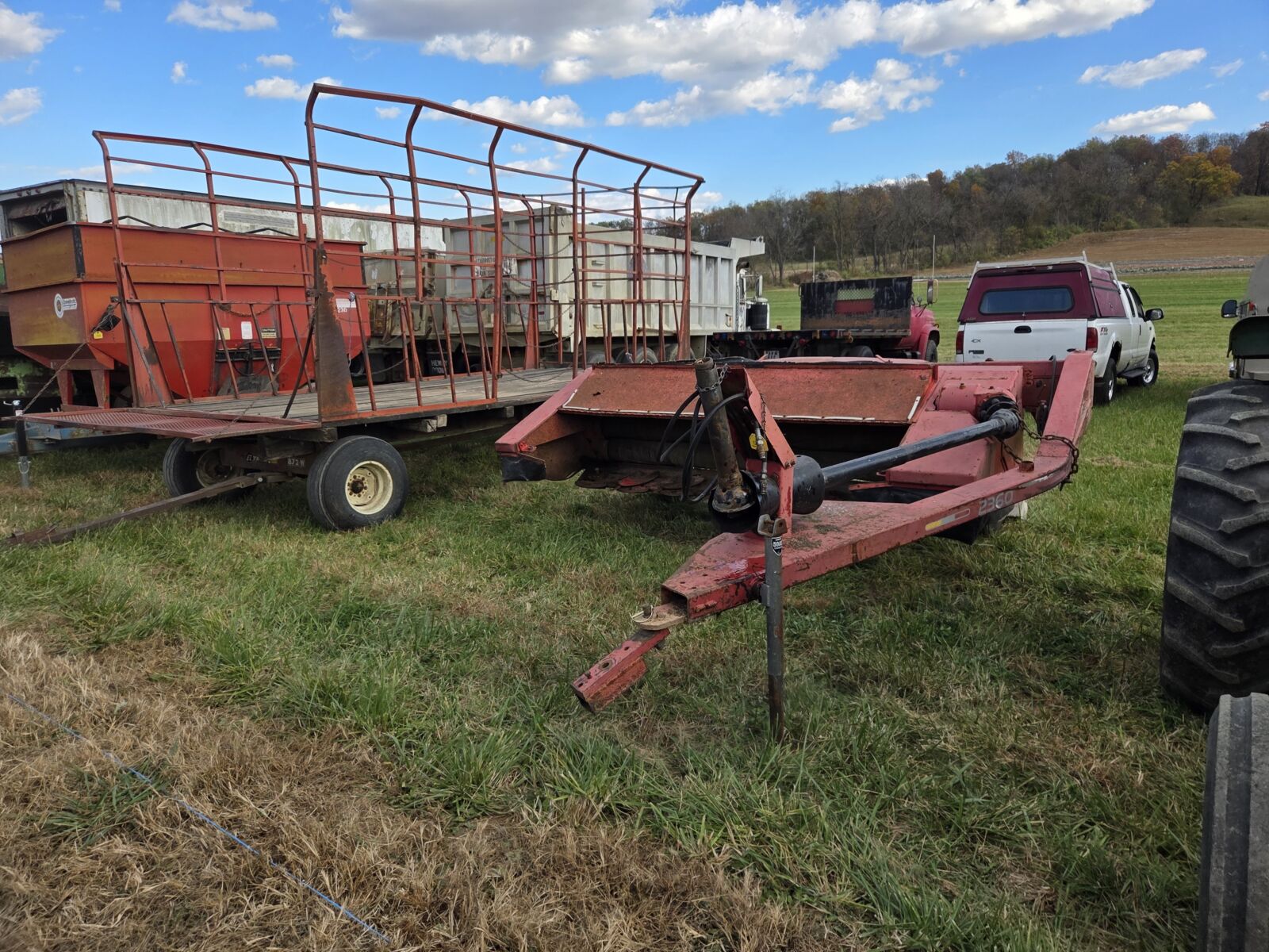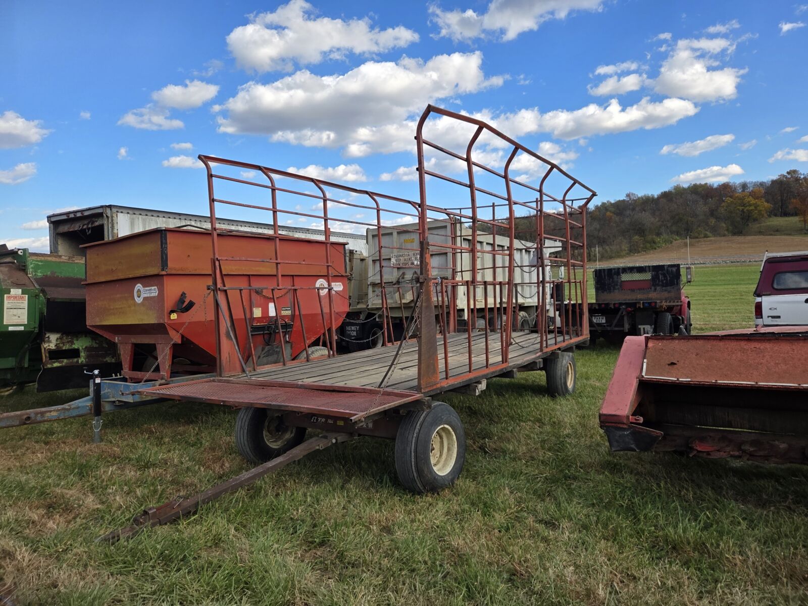 Buhler Inland 4500 34’ self loading big square bale wagon; EZ-Trail 510 grain cart, roll tarp, 500 bu.; Ficklin CA9600 auger cart, corner unload, 500 bu.; M&W 4250 bin wagon; Killbros 385 bin wagon, & others; H&S XCAP HD Twin Auger wagon, 19’, tandem axle, 14Lx16.1 tires; Miller Pro 5200 18’ forage wagon; 2 – Miller Pro 5100 16’ forage wagons; Meyers 3516 combo wagon, tandem gear; Dutch Bro. 8’x18’ steel rack wagon; Farmco 24’ feeder wagon w/ headlocks; Pequea 25’ feeder wagon.