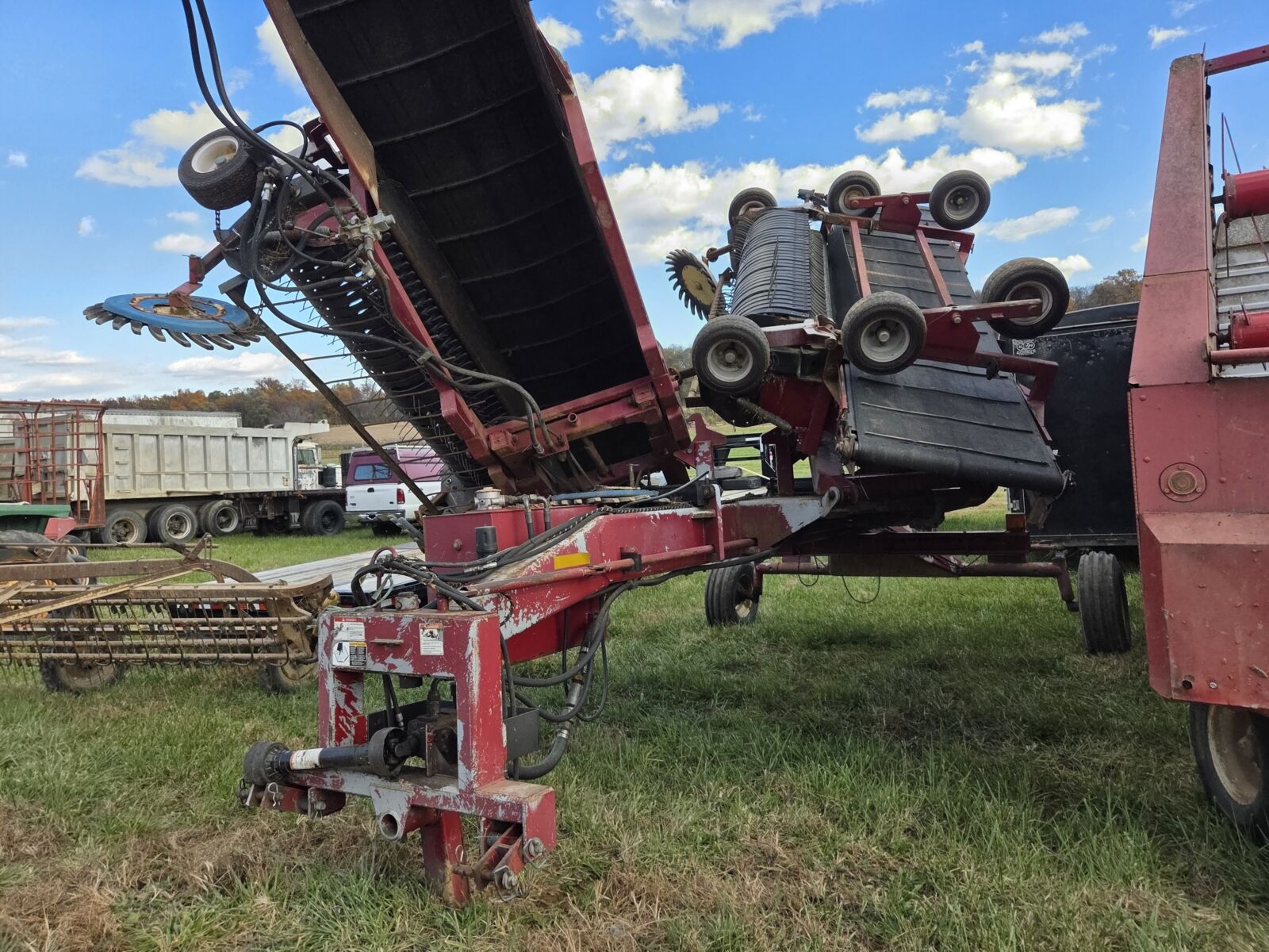 Claas Liner 800 double rotary rake; Vermeer TE330 8 star tedder, 33’ wide; Krone 82.2 8T 8 star tedder; Claas Volto 1050T tedder; Claas Volto 800TH 6 star tedder; Frontier TD2427 tedder – needs gearbox work; Vicon 8 star tedder, 2pt; Tonutti GTH540 4 star tedder; Enrossi 12 wheel rake; 2 – Pequea HR1140 rotary rakes; Ibex 3pt. 4 wheel rake; Kuhn MM900 30’ merger – field ready; Miller Pro 1800 merger; NH 166 inverter; JD 700 twin bar rake; NH 258 rake, rubber teeth; NH double rake hitch; NH 256 rake w/ dolly wheel, rubber teeth; IH 86 rake; Tubeline BF5000 bale unroller, 3pt, only 2 yrs old.