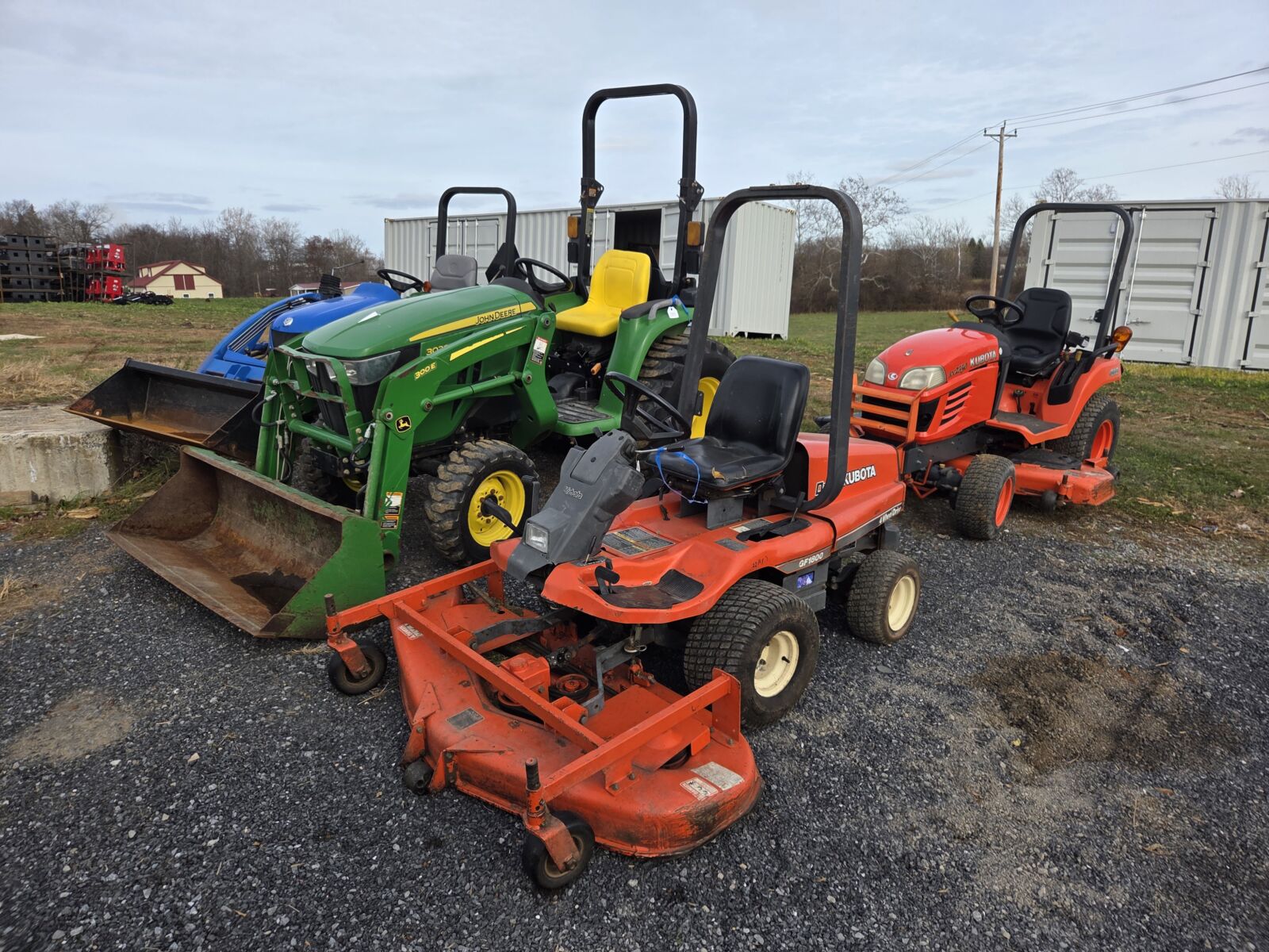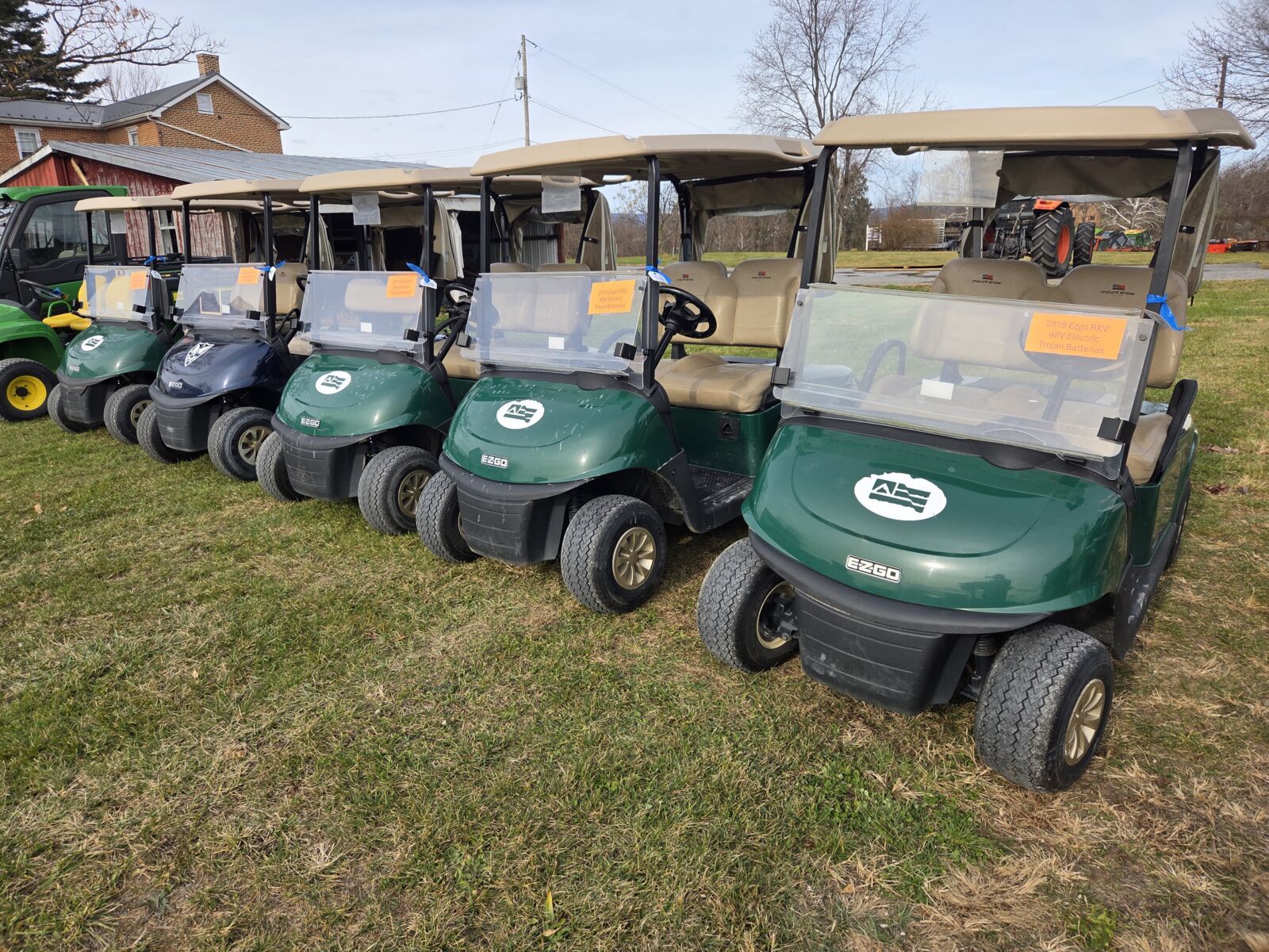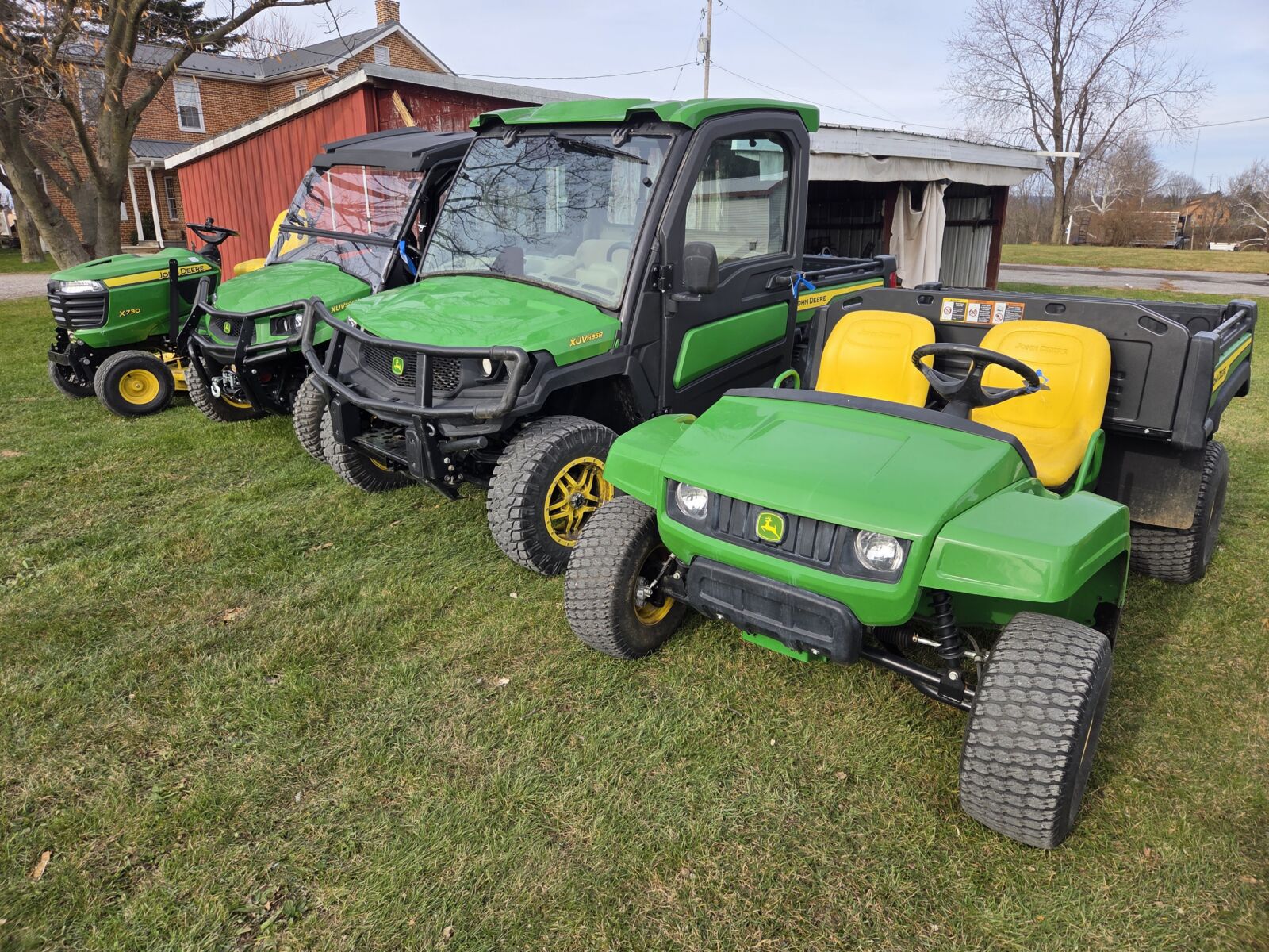 UTVs & Mowers: 2023 JD 835R gator, Cab, 142 hrs; 2023 JD 590M 86 hrs; 2023 JD 4×2 turf gator, 172 hrs; 5 – EZ-GO 48V golf carts – nice; JD 997 zero turn, 72”, Yanmar diesel, 2500 hrs; JD X730 w/ mower & snowblower; Wright Velke 48” hydro walk mower – like new; JD propane walk behind; & many more.
